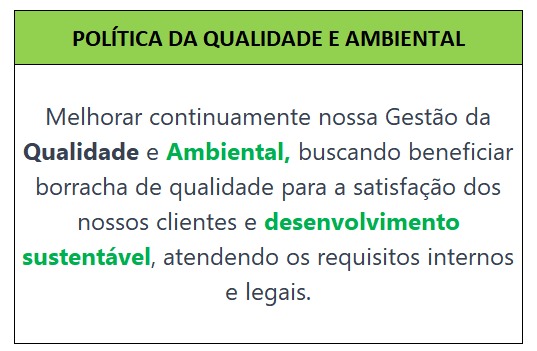 Melhorar continuamente nossa Gestão da Qualidade e Ambiental, buscando beneficiar borracha de qualidade para a satisfação dos nossos clientes e desenvolvimento sustentável, atendendo os requisitos internos e legais.